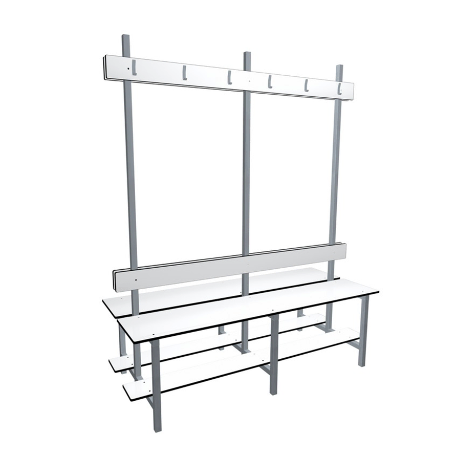 Banc de vestiaire double avec assise, repose chaussures, dossier et porte-manteaux.